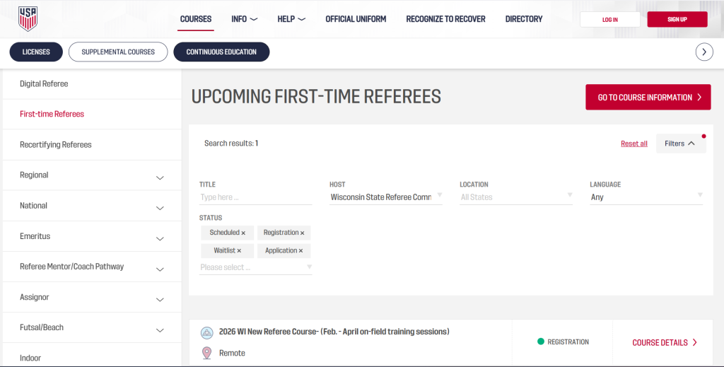 NEW Referee courses are being offered by the Wisconsin Soccer Referee Development Program (WisRef) for a 2026 USSF Referee license expiring 12/31/2026. The successful Referee candidate will have the opportunity to officiate games for the 2026 calendar year soccer seasons. Course work is available now and in-person courses will begin in February.