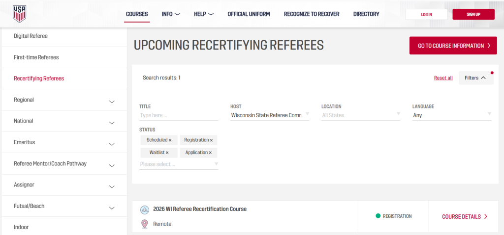 Go to the US Soccer Learning Center – under your Referee profile and navigate to the courses list. Make sure Wisconsin is the host state.
